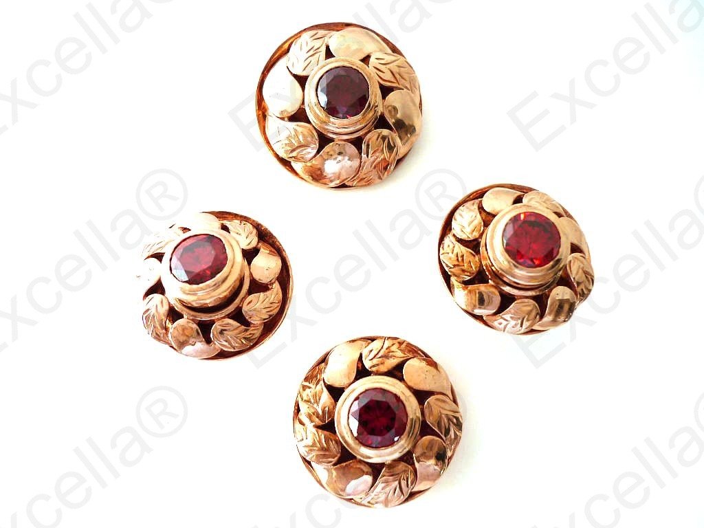 Our flower shaped, handcrafted set of gold plated 925 embossed gold with a red translucent stone: 2 earrings of 1.9 cm diameter, 1 pendant of 2.5 cm diameter, 1 ring of 2.2 cm diameter