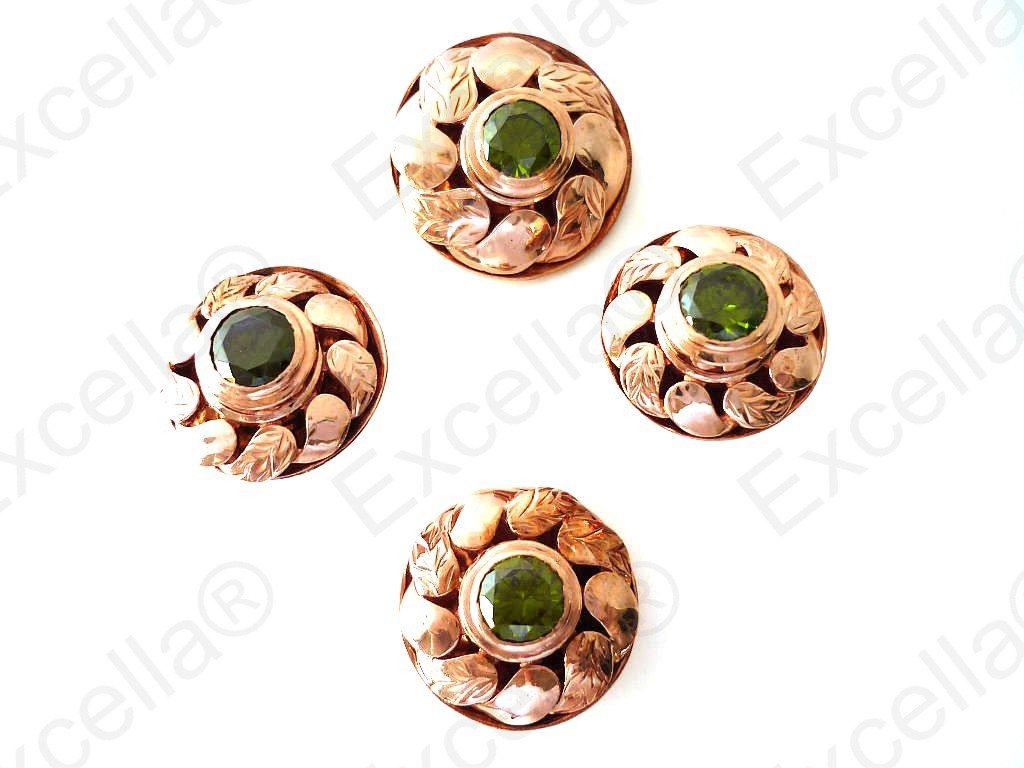 Our flower shaped, handcrafted set of gold plated 925 embossed gold with a green translucent stone: 2 earrings of 1.9 cm diameter, 1 pendant of 2.5 cm diameter, 1 ring of 2.2 cm diameter