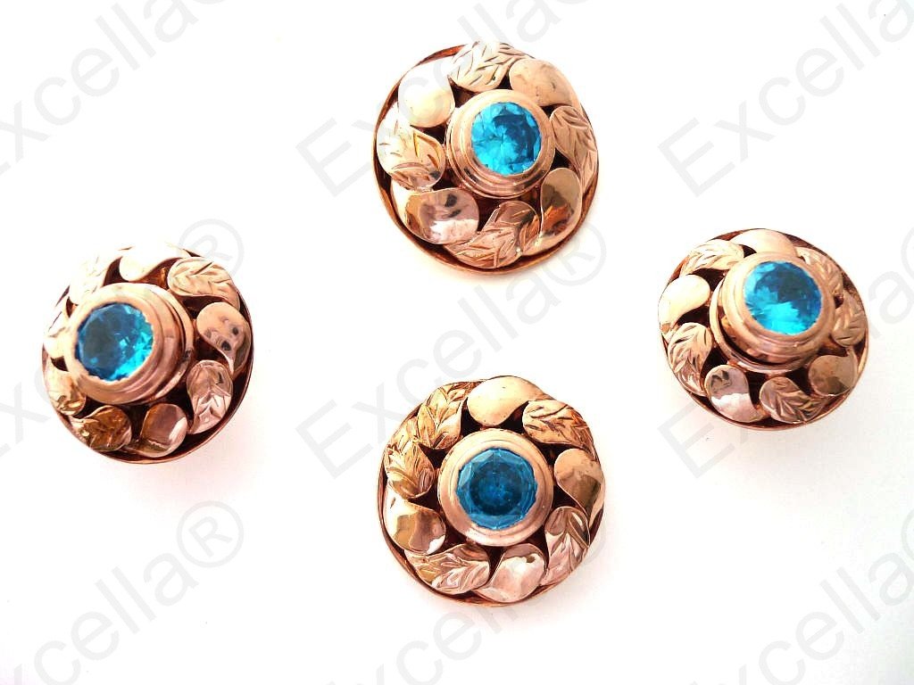 Our flower shaped, handcrafted set of gold plated 925 embossed silver with a blue translucent stone: 2 earrings of 1.9 cm diameter, 1 pendant of 2.5 cm diameter, 1 ring of 2.2 cm diameter