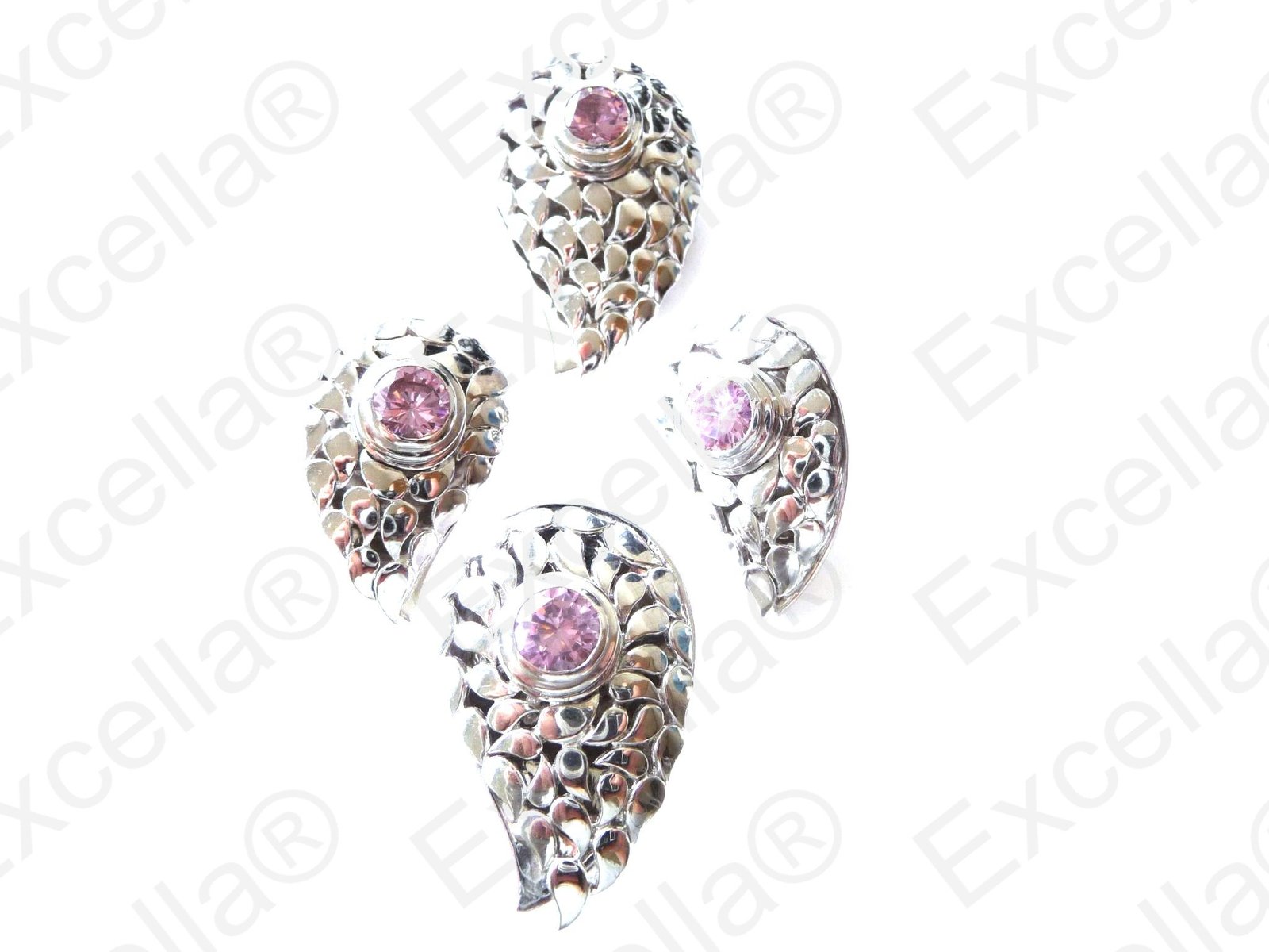 Our paisley shaped, handcrafted set of 925 silver with a pink stone. Perfect in combination but also great when just it's single items are worn. 2 earrings of 3 cm length and 1.9 cm width, 1 pendant of 4 cm length and 2.5 cm width, 1 ring of 3.6 cm length and 2.3 cm width