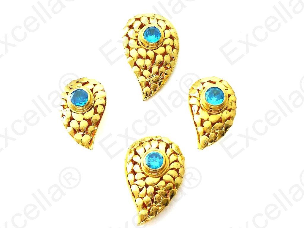 Our paisley shaped, handcrafted set of 925 bright gold with a blue stone. Perfect in combination but also great when just it's single items are worn. 2 earrings of 3 cm length and 1.9 cm width, 1 pendant of 4 cm length and 2.5 cm width, 1 ring of 3.6 cm length and 2.3 cm width