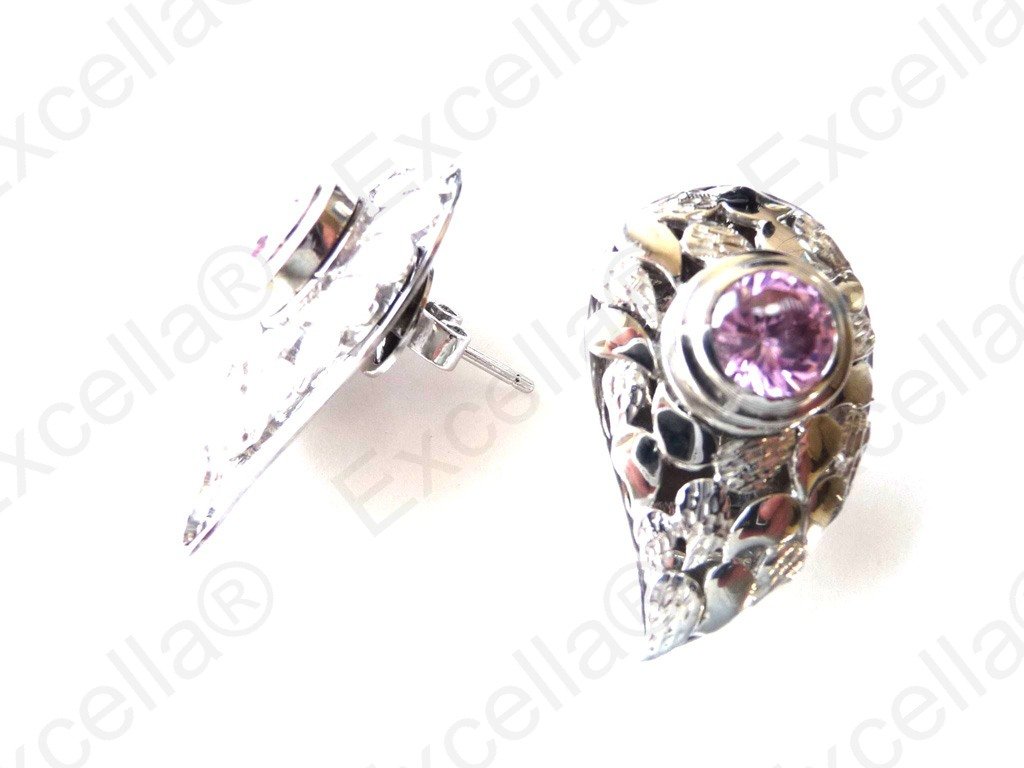 Handcrafted, unusual paisley shaped earring set in 925 silver with a brilliant pink stone and a delicate embossing. Gaps left between base and upper part allow for a delicate play of light and shade.