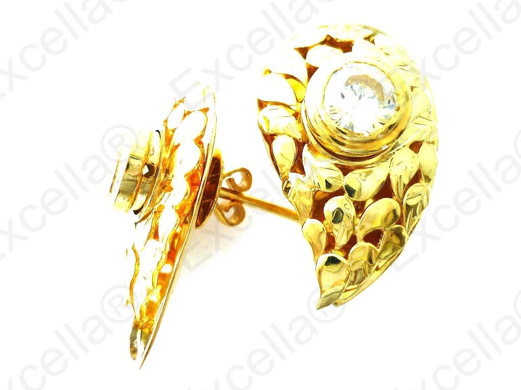 Handcrafted, unusual paisley shaped earring set in 925 gold with a brilliant white stone and a delicate embossing. Gaps left between base and upper part allow for a delicate play of light and shade.