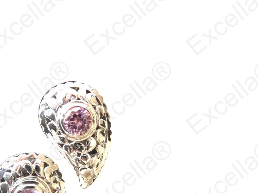 Elegant paisley shaped earring set with a surrounding border in 925 silver with a brilliant pink stone; handcrafted gaps left between base and upper part allow for a delicate play of light and shade. Length 3 cm, width 1.9 cm