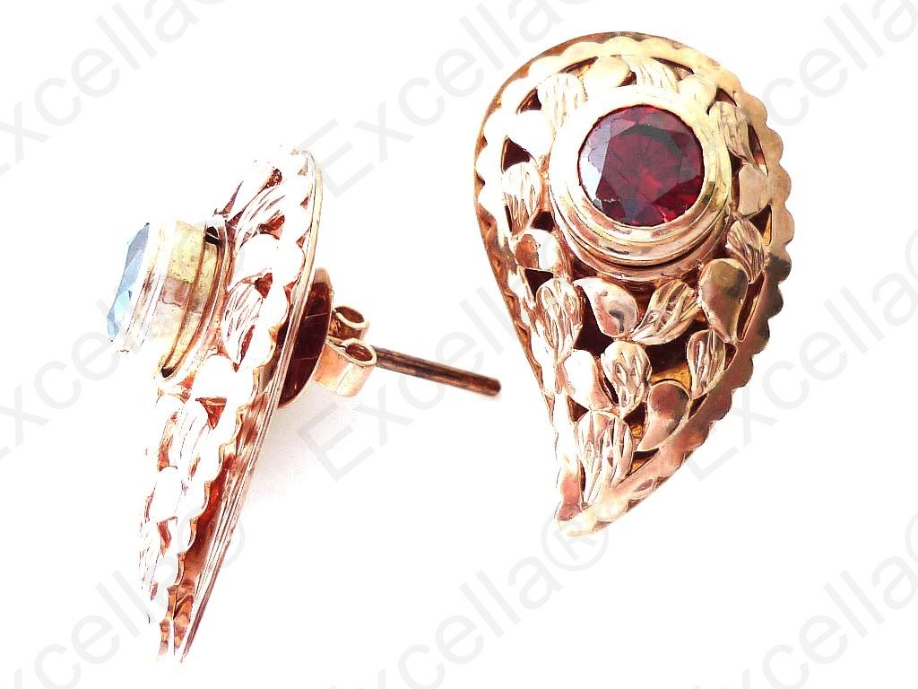 Elegant paisley shaped, embossed earring set with a surrounding border in 925 romantic brown in warm gold finish with a brilliant pink stone; handcrafted; Gaps left between base and upper part allow for a delicate play of light and shade. Length 3 cm, width 1.9 cm.