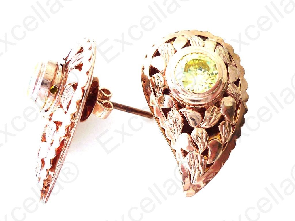 Elegant paisley shaped, embossed earring set with a surrounding border in 925 romantic brown in warm gold finish with a brilliant yellow stone; handcrafted; Gaps left between base and upper part allow for a delicate play of light and shade. Length 3 cm, width 1.9 cm.
