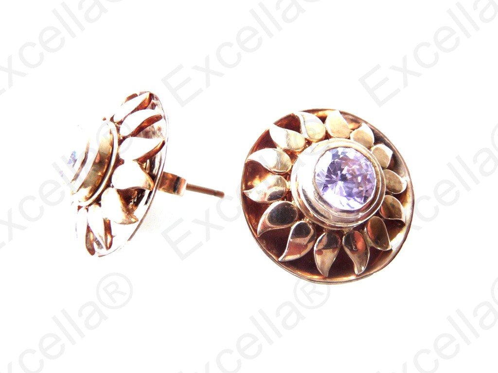 Beautiful sun shaped earring set in 925 silver with a brilliant pink stone; set off in our romantic brown finish, exquisitely handcrafted. Gaps left between base and upper part allow for a delicate play of light and shade. Diameter: 2.1 cm