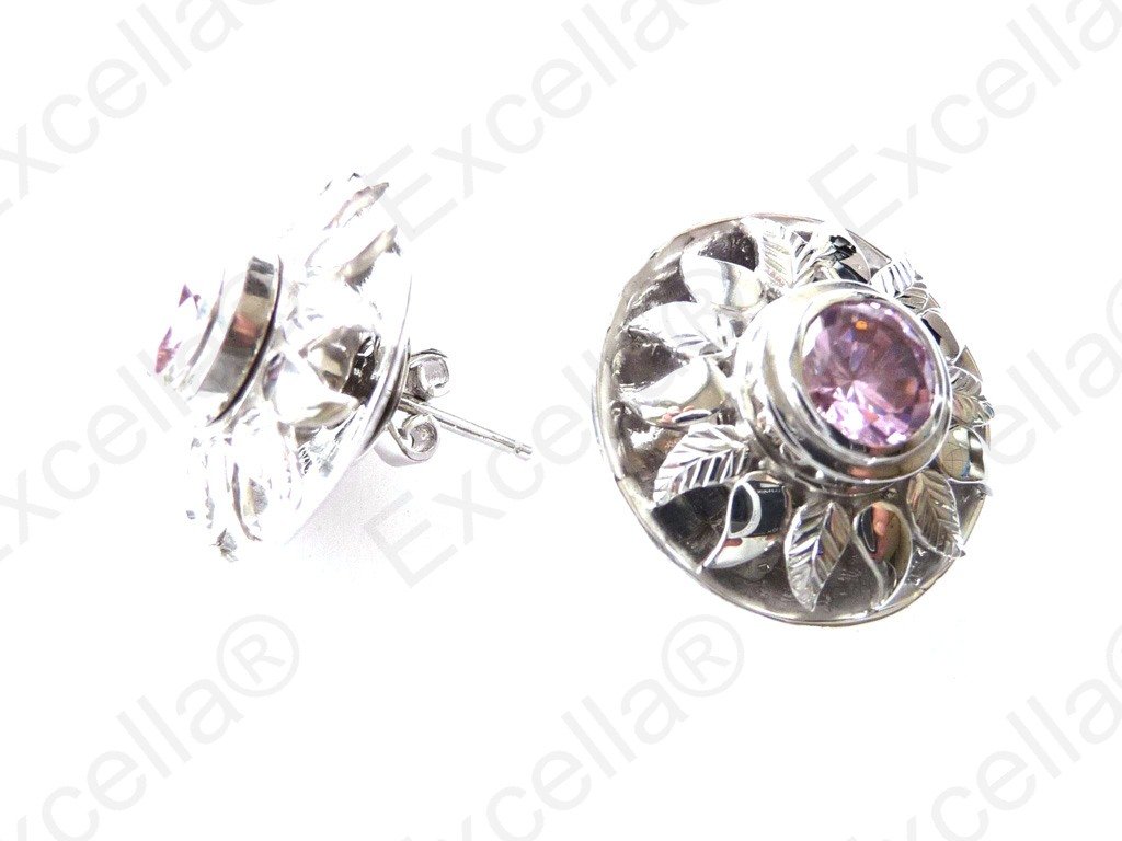 Beautiful sun shaped earring set in 925 silver with a brilliant pink stone; set off with intricate embossing details, exquisitely handcrafted. A feast for the senses. Gaps left between base and upper part allow for a delicate play of light and shade. Diameter: 2.1 cm