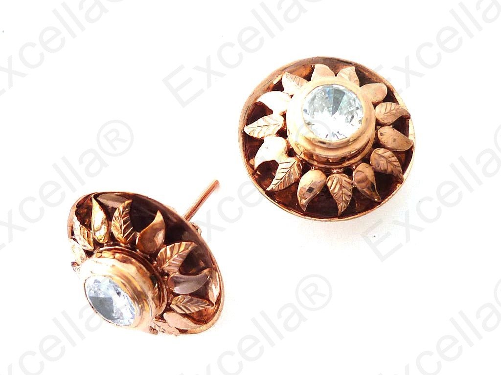 Beautiful sun shaped, embossed earring set in 925 romantic brown with a brilliant white stone; set off in warm gold finish, exquisitely handcrafted; Gaps left between base and upper part allow for a delicate play of light and shade. Diameter: 2.1 cm