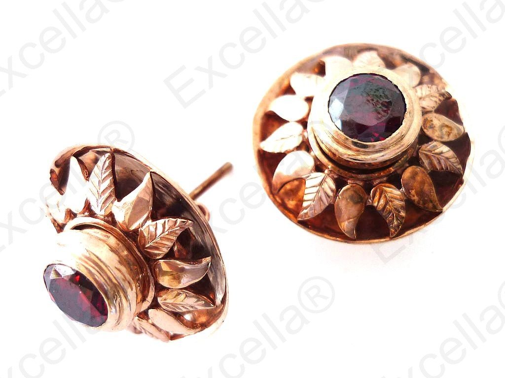 Beautiful sun shaped, embossed earring set in 925 romantic brown with a brilliant pink stone; set off in warm gold finish, exquisitely handcrafted; Gaps left between base and upper part allow for a delicate play of light and shade. Diameter: 2.1 cm
