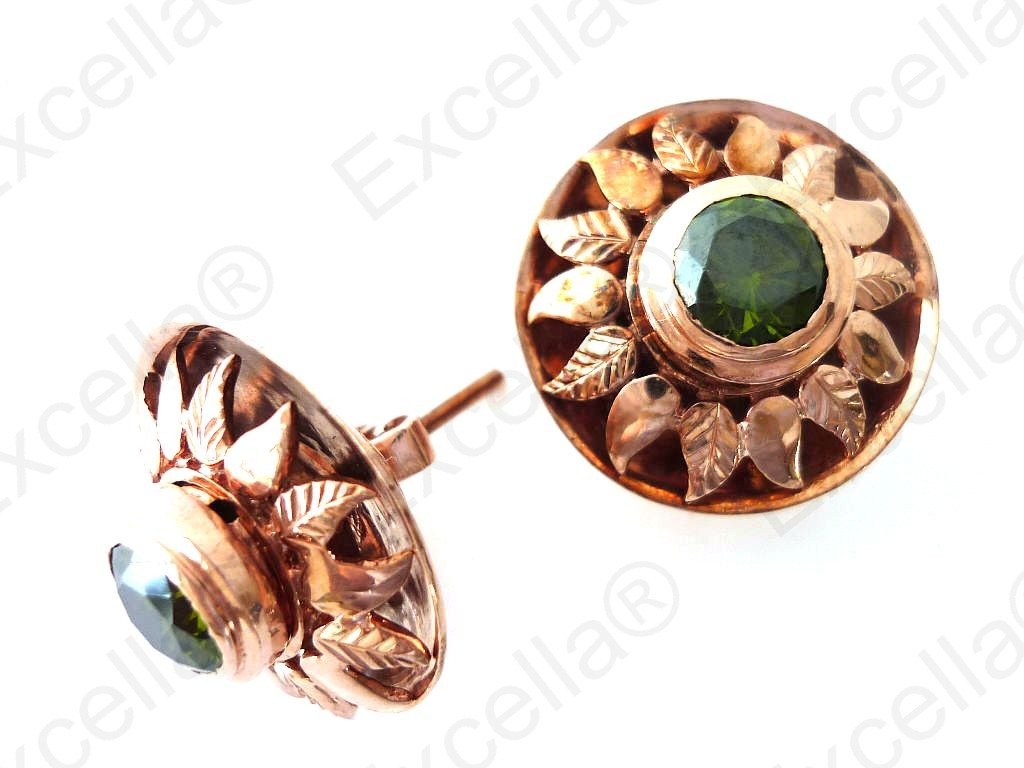 Beautiful sun shaped, embossed earring set in 925 romantic brown with a brilliant green stone; set off in warm gold finish, exquisitely handcrafted; Gaps left between base and upper part allow for a delicate play of light and shade. Diameter: 2.1 cm