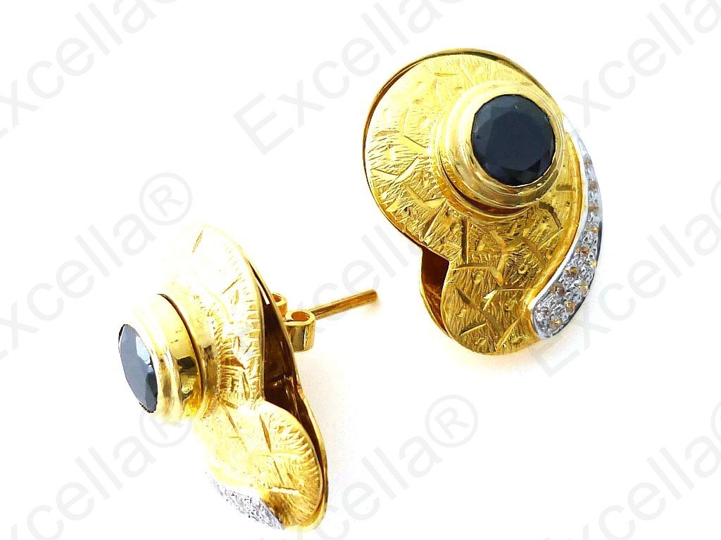 This is the earring set from a beautiful, handcrafted collection made of 925 bright gold with an embossed criss-cross finish and a shimmering outline. Each earring is fitted with a brilliant black stone. The various pieces of this set can be interchanged in such a manner that you create your very own masterpiece. A true eye catcher due to its unique design. Measurements: 2.5 x 1.8 cm