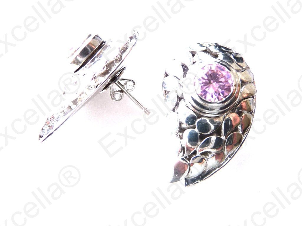 Handcrafted, unusual paisley shaped earring set in 925 silver with a brilliant pink stone; gaps left between base and upper part allow for a delicate play of light and shade.