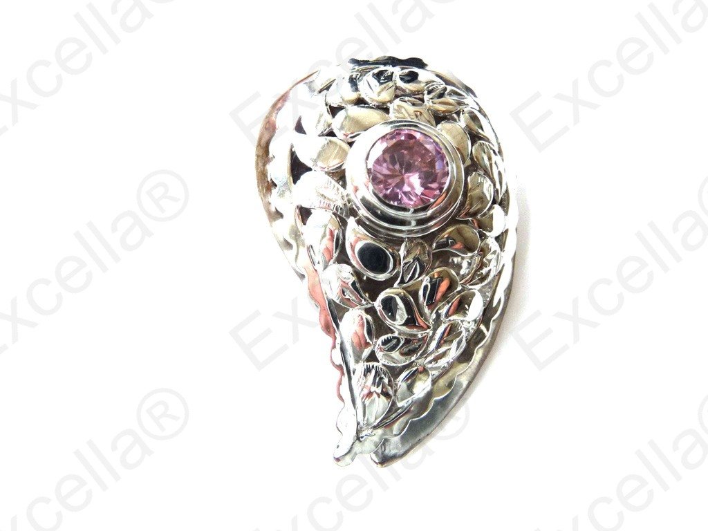 Handcrafted, paisley shaped 925 silver pendant, lavishly embossed and framed by a surrounding border, fitted with an exquisite sparkling pink stone. Exclusive design reminiscent of lace work which allows a view of subjacent pendant base. This item is the perfect focal point for your face.