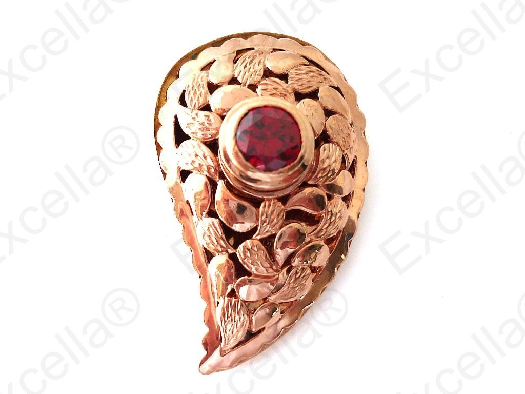 Precious paisley shaped, embossed pendant with surrounding border in 925 romantic brown plated in a golden hue and handcrafted and fitted with a brilliant red stone. Spaces left between base and upper part allow for a delicate play of light and shade. It has been crafted with particular attention to the smallest details. Length 3.50 cm, width: 2.30 cm