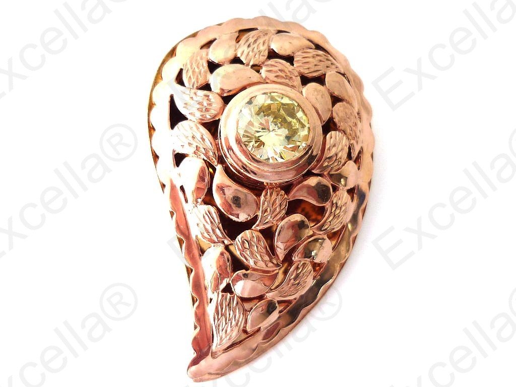 Precious paisley shaped, embossed pendant with surrounding border in 925 romantic brown plated in a golden hue and handcrafted and fitted with a brilliant yellow stone. Spaces left between base and upper part allow for a delicate play of light and shade. It has been crafted with particular attention to the smallest details. Length 3.50 cm, width: 2.30 cm