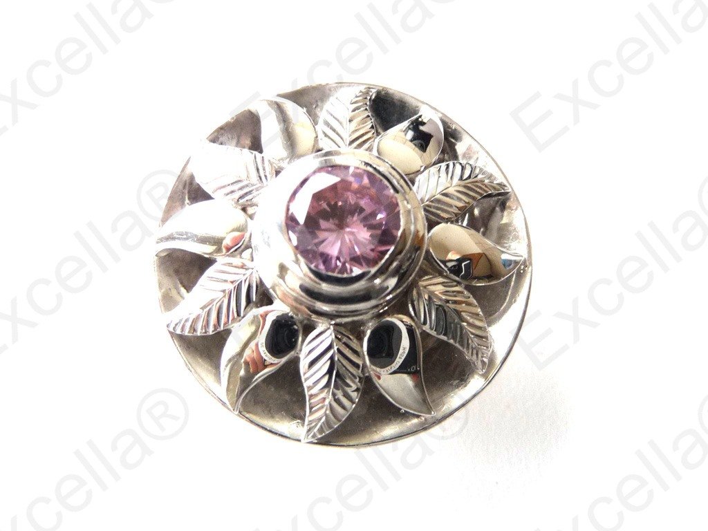 Handcrafted, spectacular sun shaped 925 silver pendant, fitted with an exclusive sparkling pink stone and perfected with delicate embossing. The cut outs allow the view onto the subjacent base plate of the pendant, catching the light with every move you make. A true work of craftsmanship. Diameter: 3.0 cm