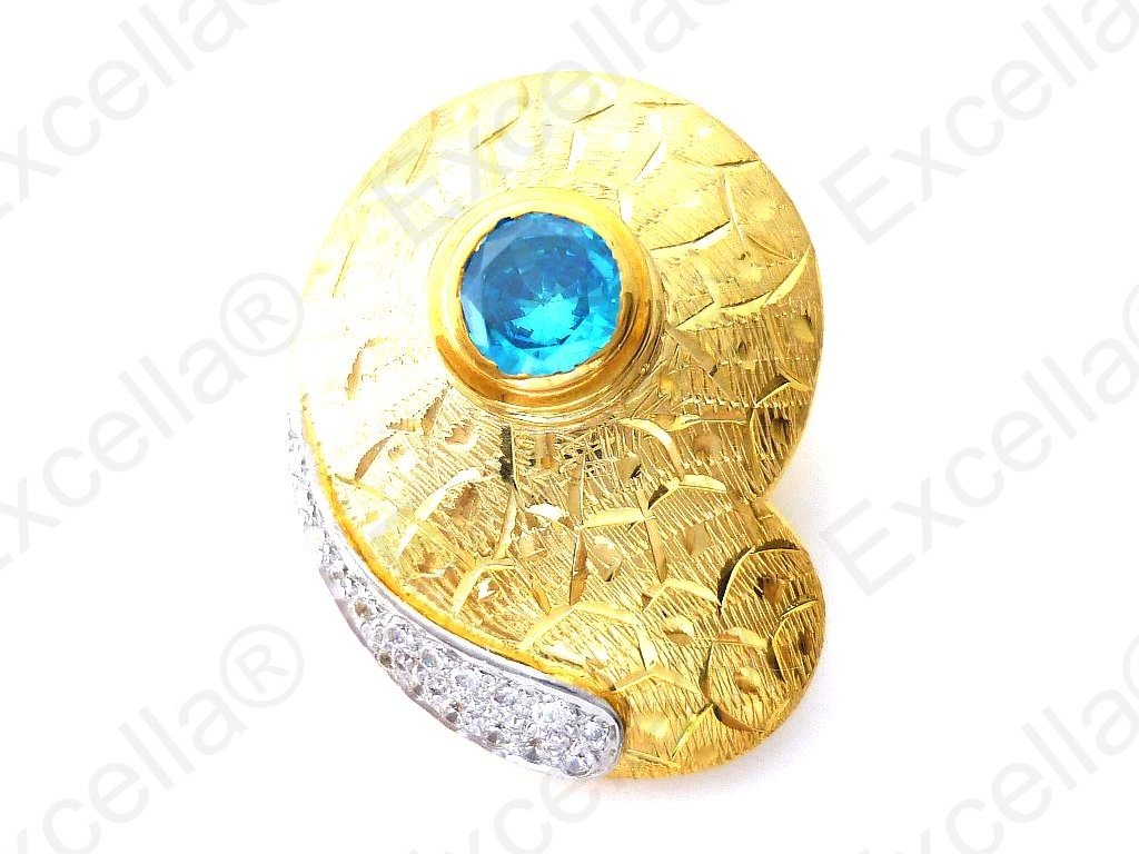 This is the beautiful, handcrafted pendant of 925 bright gold with an embossed criss-cross finish, fitted with a brilliant blue stone and enhanced with a curve of sparkling stones. Its appearance can be changed completely by exchanging the stone with another one from our range. A true eye catcher due to its unique design. Measurements: 3.4 x 2.5 cm
