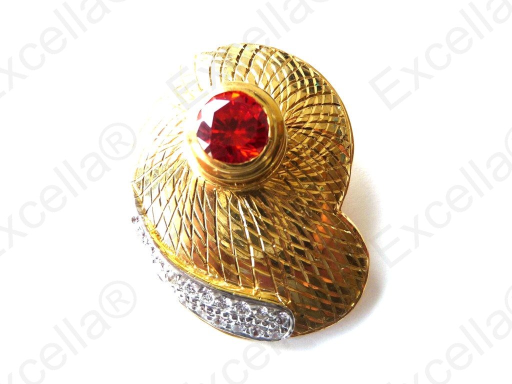 This is the beautiful, handcrafted pendant of 925 silver with an embossed warm golden finish, fitted with a brilliant red stone and enhanced with a curve of sparkling stones. Its appearance can be changed completely by exchanging the stone with another one from our range. Reflects each and every ray of light surrounding you. Measurements: 3.4 x 2.5 cm