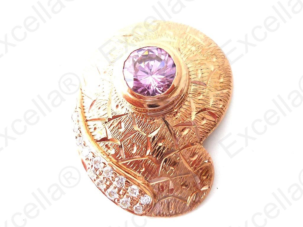 This is the beautiful, handcrafted pendant of 925 romantic brown with an embossed criss-cross finish, fitted with a brilliant pink stone and enhanced with a curve of sparkling stones. Its appearance can be changed completely by exchanging the stone with another one from our range. A true eye catcher due to its unique design. Measurements: 3.4 x 2.5 cm