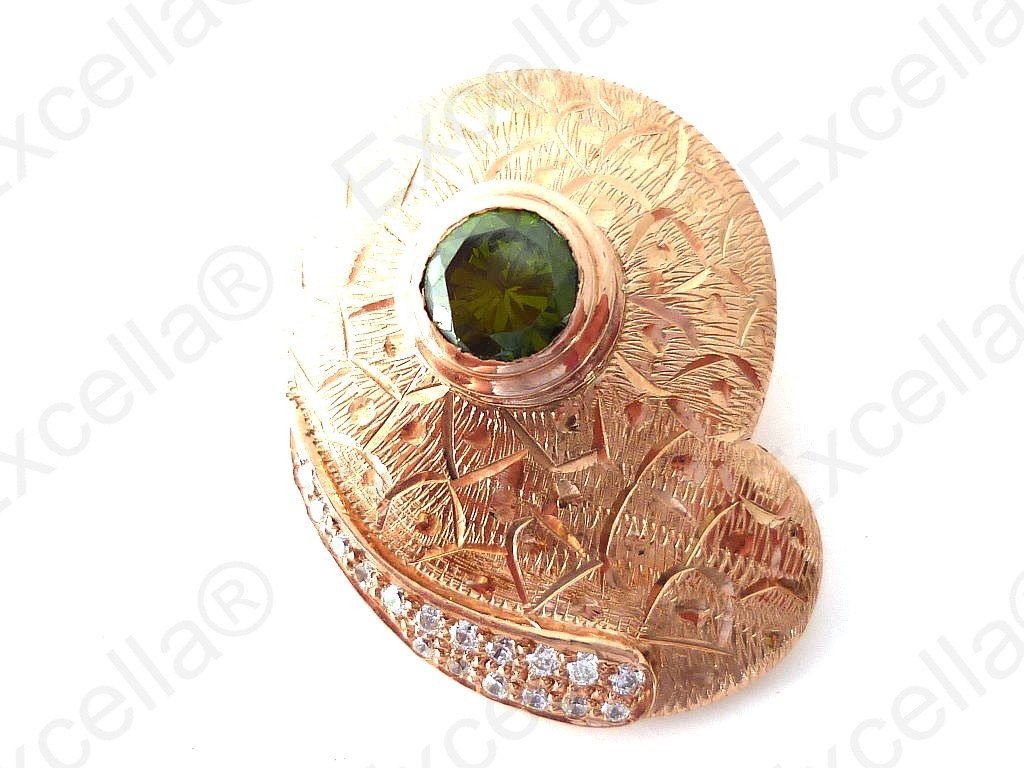This is the beautiful, handcrafted pendant of 925 romantic brown with an embossed criss-cross finish, fitted with a brilliant green stone and enhanced with a curve of sparkling stones. Its appearance can be changed completely by exchanging the stone with another one from our range. A true eye catcher due to its unique design. Measurements: 3.4 x 2.5 cm