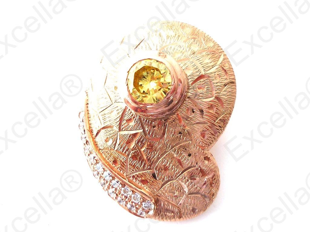 This is the beautiful, handcrafted pendant of 925 romantic brown with an embossed warm golden finish, fitted with a brilliant whte stone and enhanced with a curve of sparkling stones. Its appearance can be changed completely by exchanging the stone with another one from our range. Reflects each and every ray of light surrounding you. Measurements: 3.4 x 2.5 cm