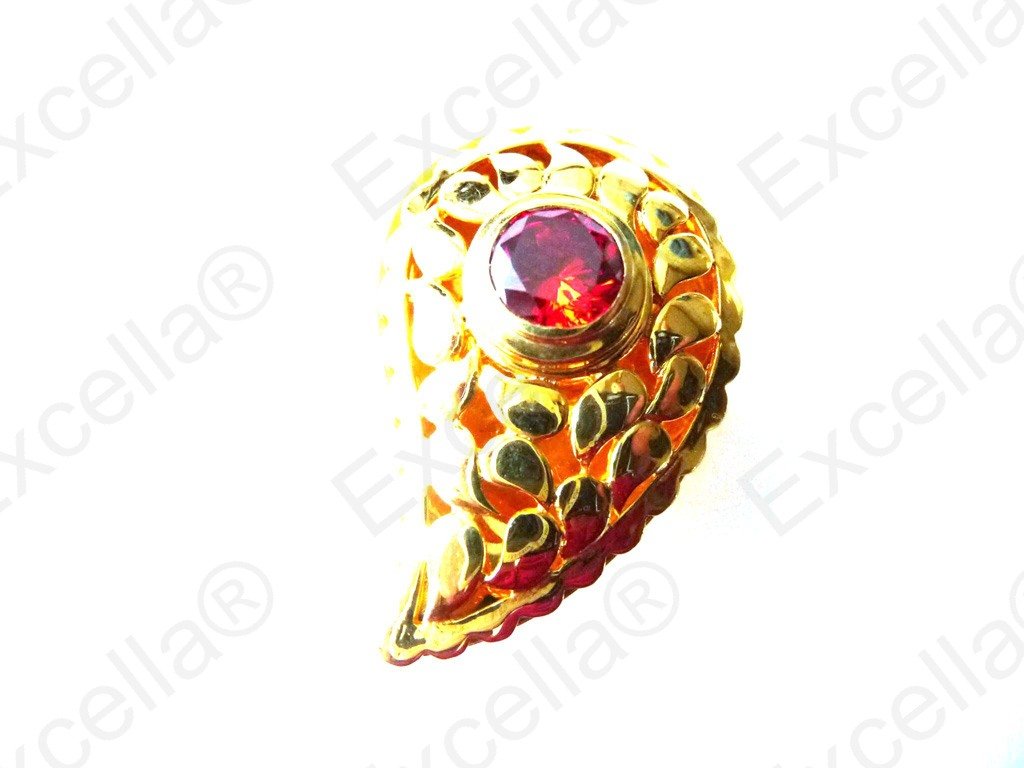 Precious paisley shaped ring with surrounding border in 925 silver, plated in a golden hue and handcrafted and fitted with a brilliant red stone. Spaces left between base and upper part allow for a delicate play of light and shade. It has been crafted with particular attention to the smallest details. Length 3.50 cm, width: 2.30 cm