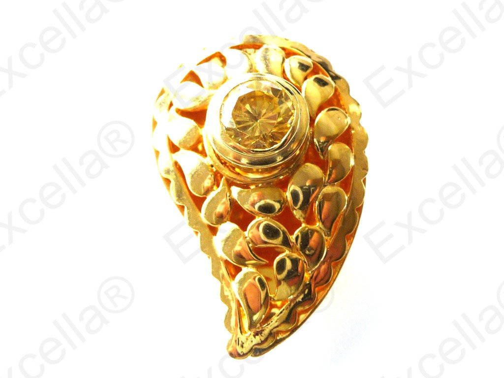 Precious paisley shaped ring with surrounding border in 925 silver, plated in a golden hue and handcrafted and fitted with a brilliant yellow stone. Spaces left between base and upper part allow for a delicate play of light and shade. It has been crafted with particular attention to the smallest details. Length 3.50 cm, width: 2.30 cm
