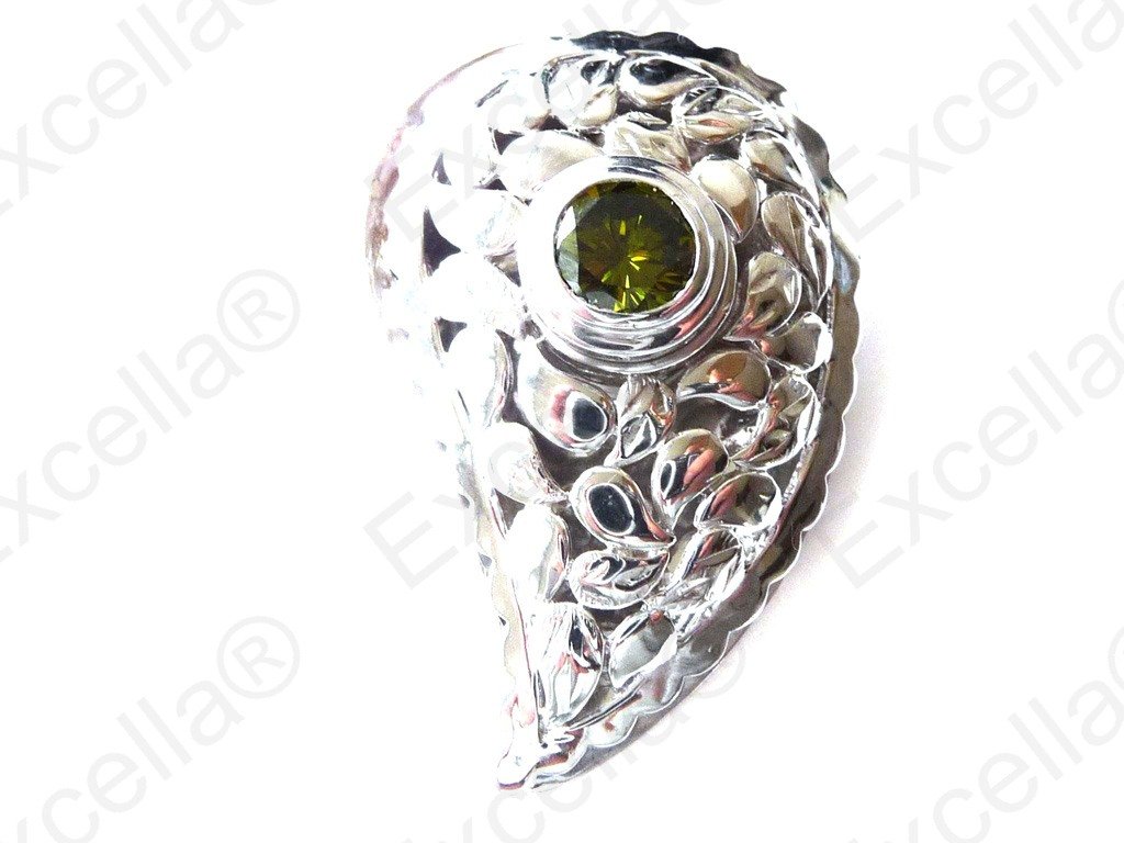 Precious paisley shaped ring with surrounding border in 925 embossed silver, handcrafted and fitted with a brilliant green stone. Spaces left between base and upper part allow for a delicate play of light and shade. Length 3.50 cm, width: 2.30 cm