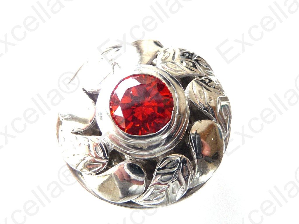 Harmonious flower shaped, embossed ring in 925 silver, handcrafted and fitted with a brilliant red stone.