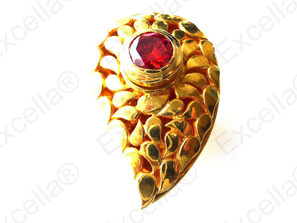 Elegant paisley shaped ring in 925 silver with a gold hue, handcrafted and fitted with a brilliant red stone. The stark graphic impact makes it a real show stopper. This is truly elegant. Spaces left between base and upper part allow for a delicate play of light and shade. Length 3.60 cm, width 2.30 cm