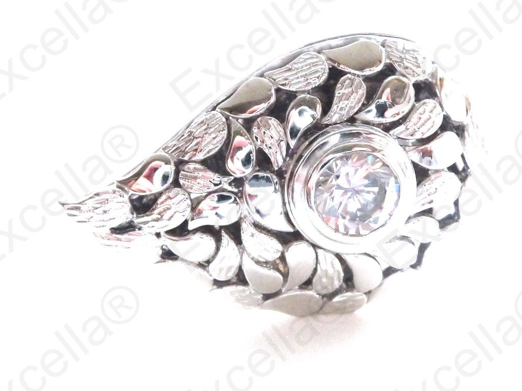 Elegant paisley shaped ring in 925 silver with an exquisite embossing, handcrafted and fitted with a brilliant black stone. An intricate leafy design. Spaces left between base and upper part allow for a delicate play of light and shade. Length 3.60 cm, width 2.30 cm