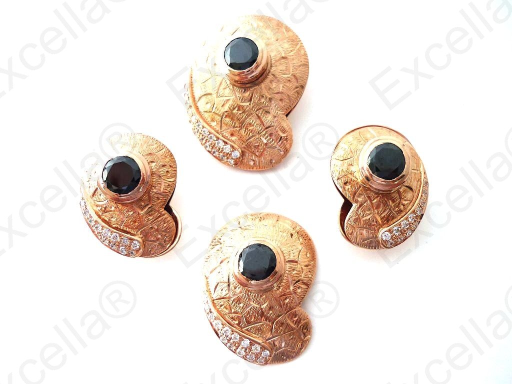 This is the complete set of a beautiful, handcrafted collection made of 925 romantic brown with an embossed criss-cross finish. Each of these items is fitted with a brilliant black stone. The various pieces of this set can be interchanged in such a manner that you create your very own masterpiece. A true eye catcher due to its unique design. Pendant: 3.4 x 2.5 cm, Ring: 3 x 2.3 cm, Earrings: 2.5 x 1.8 cm